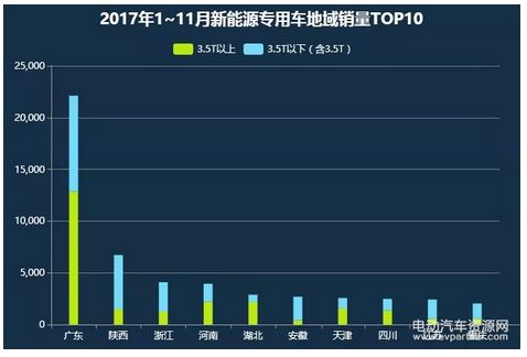 從銷(xiāo)售區(qū)域看,2017年1-11月,廣東地區(qū)銷(xiāo)售新能源專(zhuān)用車(chē)最多,達(dá)到22116臺(tái)。前11月銷(xiāo)售新能源專(zhuān)用車(chē)在2000臺(tái)以上的共10個(gè)省市,分別為:廣東、陜西、浙江、河南、湖北、安徽、天津、四川、江蘇、重慶。