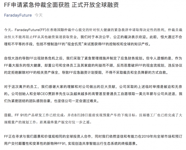 10月25日晚間,F(xiàn)F發(fā)布官方聲明稱:“FF申請(qǐng)緊急仲裁全面獲勝 正式開放全球融資”。然而,車事小說(shuō)查閱恒大健康發(fā)布的公告內(nèi)容后發(fā)現(xiàn),F(xiàn)F的官方聲明內(nèi)容并不全面。