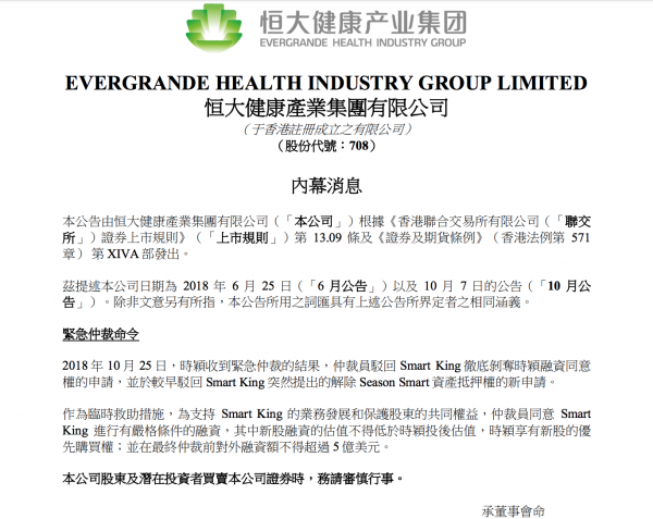 恒大健康發(fā)布的公告顯示:2018年10月25日,時(shí)潁收到緊急仲裁的結(jié)果,仲裁員駁回了SmartKing徹底剝奪時(shí)潁融資同意權(quán)的申請(qǐng),并駁回 SmartKing 突然提出的解除 SeasonSmart資產(chǎn)抵押權(quán)的新申請(qǐng)。