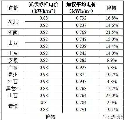 普通地面電站項(xiàng)目,由于大部分項(xiàng)目都位于Ⅲ類電價(jià)區(qū),雖然標(biāo)桿電價(jià)相同,但各地資源條件相差很大。根據(jù)各地的資源條件情況、項(xiàng)目競(jìng)爭(zhēng)情況,中標(biāo)電價(jià)的加權(quán)值下降幅度在2%~22%之間。其中,河南、山西的下降幅度最大。