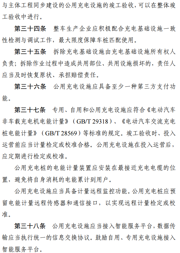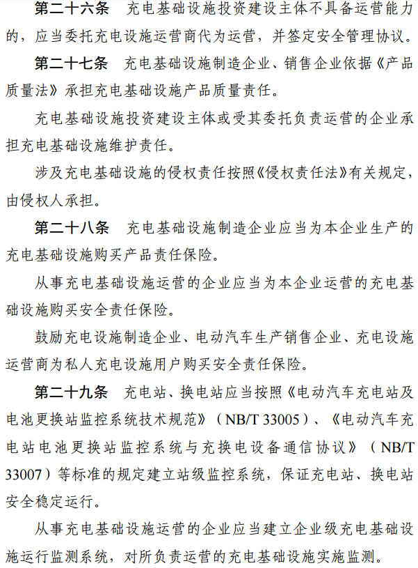 電動(dòng)汽車生產(chǎn)銷售企業(yè)應(yīng)當(dāng)將充電設(shè)施建設(shè)維護(hù)納入其銷售服務(wù)體系,委托充電設(shè)施施工企業(yè)提供施工服務(wù)或委托充電設(shè)施運(yùn)營商提供綜合性服務(wù)。與私人用戶簽訂銷售車輛合同之前,應(yīng)當(dāng)告知用戶提供的充電樁產(chǎn)品參數(shù)、價(jià)格、產(chǎn)品責(zé)任保險(xiǎn)、建設(shè)維護(hù)服務(wù)內(nèi)容、服務(wù)收費(fèi)標(biāo)準(zhǔn)等基本信息。用戶可選擇接受電動(dòng)汽車生產(chǎn)銷售企業(yè)提供的產(chǎn)品和服務(wù),也可另行委托充電設(shè)施運(yùn)營商提供綜合性服務(wù)。