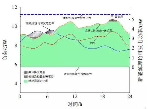 對于內(nèi)部無網(wǎng)絡(luò)約束的系統(tǒng),新能源消納只需滿足發(fā)、用電動態(tài)平衡和系統(tǒng)調(diào)節(jié)能力下限約束,“負(fù)荷+聯(lián)絡(luò)線外送功率”曲線與系統(tǒng)調(diào)節(jié)能力下限之間的系統(tǒng)調(diào)節(jié)空間,即理論上的新能源最大消納空間。