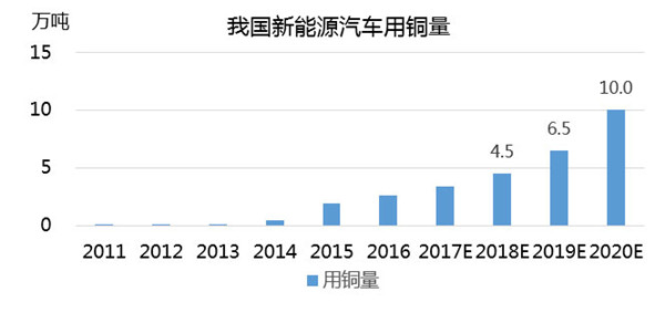 根據(jù)新能源汽車產(chǎn)量和單車用銅量50公斤推算,計算出每年新能源汽車的用銅量,如上圖所示,預計到2020年新能源汽車用銅量將增加到10萬噸左右。