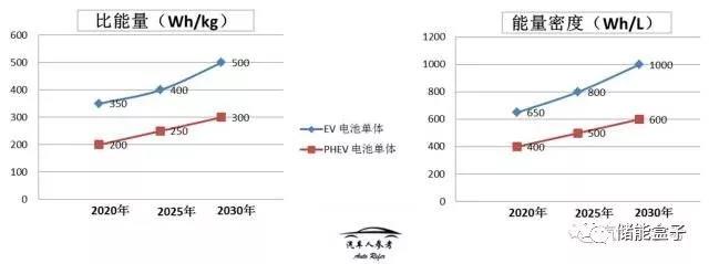 根據(jù)16年發(fā)布的“節(jié)能與新能源汽車技術(shù)路線圖”,我們可以大概對動力電池發(fā)展趨勢有一個概念,下圖所示,到2020年,純電動汽車電池單體比能量要達到350Wh/kg