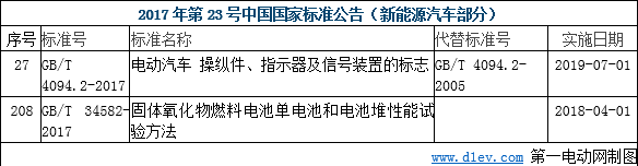 9月29日,國標委發(fā)布2017年第23號中國國家標準公告,共批準237項國家標準。其中包括《電動汽車操縱件、指示器及信號裝置的標志》、《固體氧化物燃料電池單電池和電池堆性能試驗方法》兩項國標。