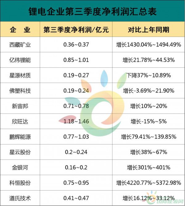 鵬輝、新宙邦、欣旺達等11家鋰電上市公司三季報八成預喜,億緯鋰能凈利最高,科恒大幅增長