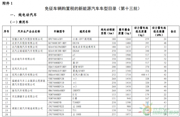 兩部門發(fā)布《免征車輛購置稅的新能源汽車車型目錄》(第十三批)公告