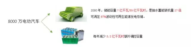 一是車載電池,按照2030年全國(guó)電動(dòng)汽車保有量達(dá)到8000萬(wàn)輛的預(yù)測(cè),電動(dòng)汽車每年充電需求將達(dá)到4100億千瓦時(shí),理論儲(chǔ)能容量達(dá)到7億千瓦/55億千瓦時(shí),其功率儲(chǔ)能的容量約為目前全國(guó)抽水蓄能裝機(jī)量的27倍。2030年風(fēng)電,光伏發(fā)電電量將達(dá)到42.1億千瓦時(shí),則僅電動(dòng)乘用車的有效儲(chǔ)能容量即可滿足97%波動(dòng)性可再生能源日發(fā)電量的存儲(chǔ),如果電動(dòng)汽車能夠有序充放電,則可以減少額外投資而獲得的巨大調(diào)控容量。