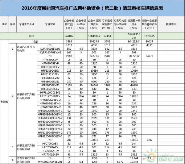 以下為《2016年度新能源汽車推廣應(yīng)用補(bǔ)助資金(第二批)清算審核車輛信息表》詳細(xì)情況: