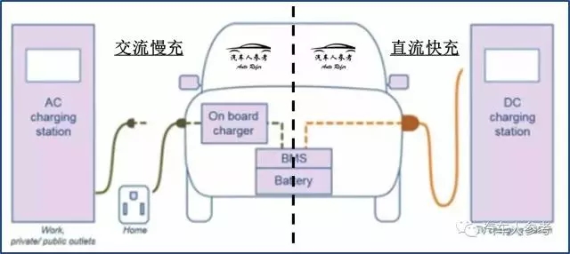 現(xiàn)在市場(chǎng)上電動(dòng)汽車(chē)交流慢充是標(biāo)配,直流快充是選配。對(duì)于快慢充兼具的電動(dòng)汽車(chē),比如特斯拉,在快充模式下,可以直接繞過(guò)車(chē)載充電器,由充電樁直接連接電池進(jìn)行充電,見(jiàn)下圖。