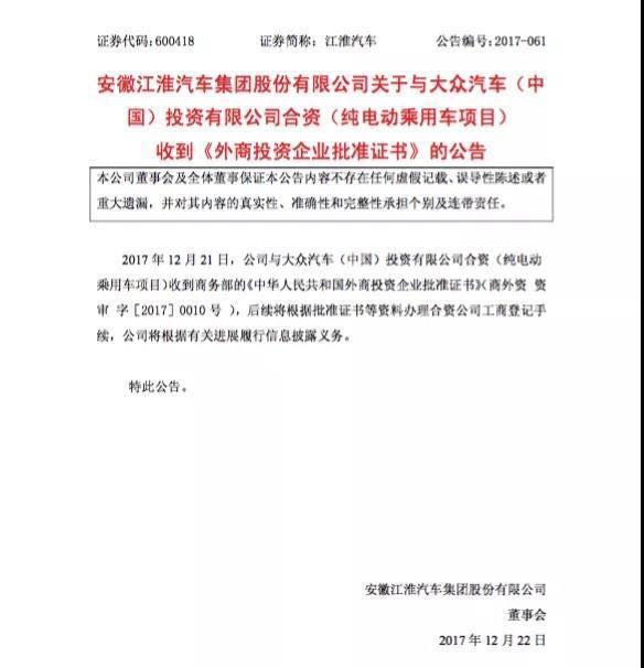 距離9月7日江淮汽車發(fā)布公告,稱與大眾正式簽署合資合作諒解備忘錄,將在新能源領(lǐng)域成立一家合資公司后不足4個(gè)月,這一合資項(xiàng)目便火速獲得商務(wù)部的批準(zhǔn)。安徽江淮汽車股份有限公司(600418,SH)在21日晚間發(fā)布的公