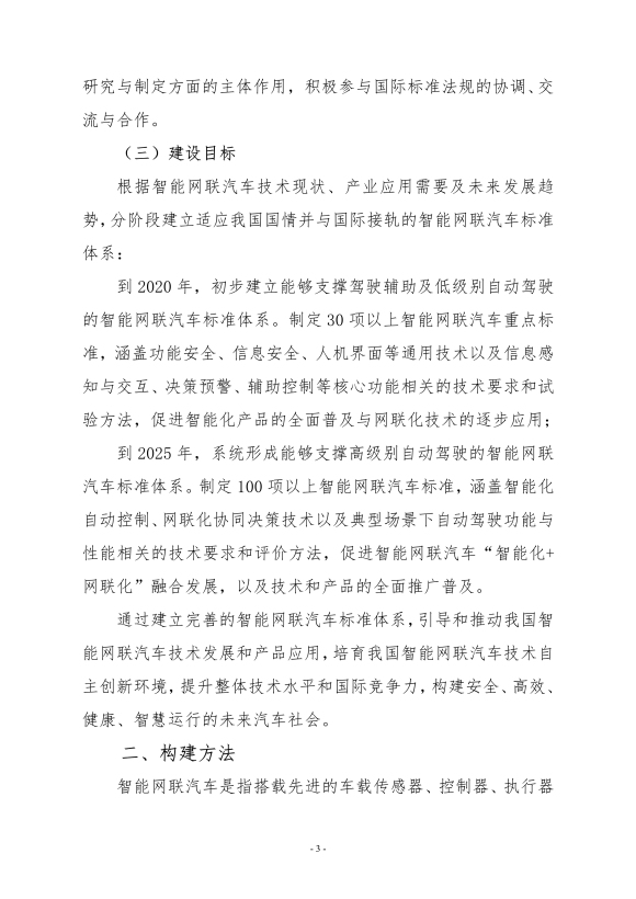根據智能網聯(lián)汽車技術現(xiàn)狀、產業(yè)應用需要及未來發(fā)展趨勢,分階段建立適應我國國情并與國際接軌的智能網聯(lián)汽車標準體系:到 2020 年,初步建立能夠支撐駕駛輔助及低級別自動駕駛的智能網聯(lián)汽車標準體系。制定 30 項以上智能網聯(lián)汽車重點標準,涵蓋功能安全、信息安全、人機界面等通用技術以及信息感知與交互、決策預警、輔助控制等核心功能相關的技術要求和試驗方法,促進智能化產品的全面普及與網聯(lián)化技術的逐步應用。