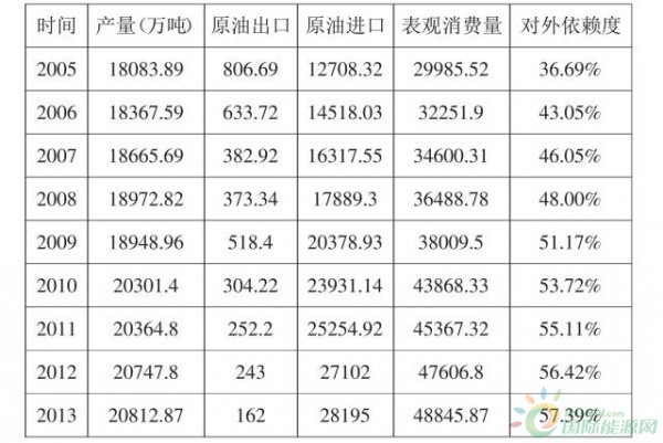 表 1  2005 ~ 2013 年中國原油進出口、表觀消費量、對外依存度數(shù)據(jù)