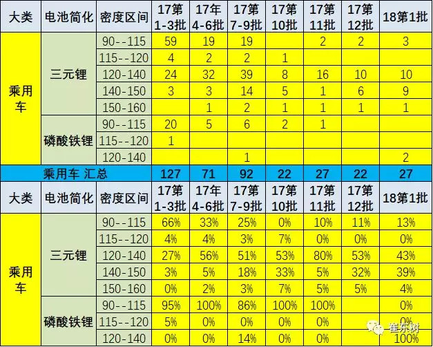 以上為純電動且非快充的電池的特征。2018年純電乘用車的能量密度的提升也是較快,但2018年第1批乘用車車高于120的占到90%,140-150瓦的純電三元電池的達(dá)到9款。低能量密度的電池有所回升。而且本批的磷酸鐵鋰電池的車型也有出現(xiàn),能量密度表現(xiàn)120 ,也是能拿到正常補(bǔ)貼的。