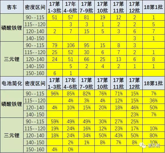 2018年客車電池提升很快,磷酸鐵鋰的占比保持90%以上,第1批磷酸鐵鋰的電池的能量密度達(dá)到120以下為0%.而錳酸鋰也是基本都是高于140。由于客車的競爭相對充分,大部分客車企業(yè)都能實現(xiàn)120的補(bǔ)貼鼓勵要求。客車目前主要貼著補(bǔ)貼推動,但高于140瓦/千克的新品也是已經(jīng)成為新品主流。