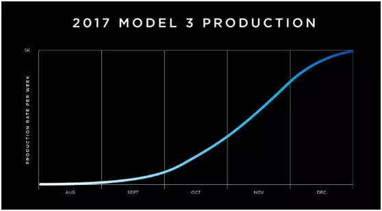 記得這張圖嘛,Musk 在發(fā)布 Model 3 的時(shí)候表示,12 月周產(chǎn)達(dá)到 5000臺(tái)。看看這個(gè)曲線,一個(gè)典型的指數(shù)級(jí)增長(zhǎng)圖,而非線性增長(zhǎng)。特斯拉有信心實(shí)現(xiàn)這種增長(zhǎng)的原因,就在于他們這種連同生產(chǎn)工具一并進(jìn)行全新研發(fā)的思維,理論上講,這確實(shí)是符合邏輯的。