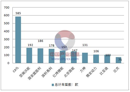 2017 年前10 批目錄中共有146 家不同的電池供應(yīng)商匹配了2949 款車型,其中前十大電池廠商匹配了1860 款,占比68%,行業(yè)集中度高。龍頭CATL 共配套了 585 款車型,排名第一;堅瑞沃能、國安盟固利和國軒高科分居第事、三、四位,各配套了192 款、186 款和178 款車型。在乘用車方面,前三名CATL、比亞迪和國軒高科分別配套了49 款、29 款和24 款車型,較多的乘用車配套車型數(shù)將為公司動力電池組的銷量帶來保障。