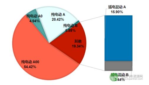 從2017年新能源乘用車細分動力類型與車型結(jié)構(gòu)看,純電動A00級車型累計銷售30.3萬臺,占比53.35%,同比累計增長173%,仍是最大的市場。
