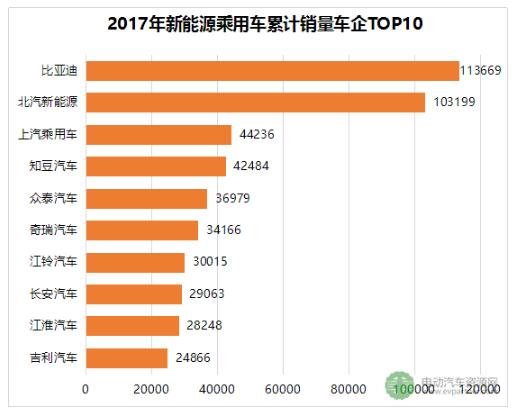 從車企表現(xiàn)看,2017年新能源乘用車累計銷量突破十萬臺的車企有兩家,其中比亞迪累計銷售113669,占比20.43%,奪得冠軍;北汽新能源累計銷售103199臺,占比18.55%奪得亞軍。