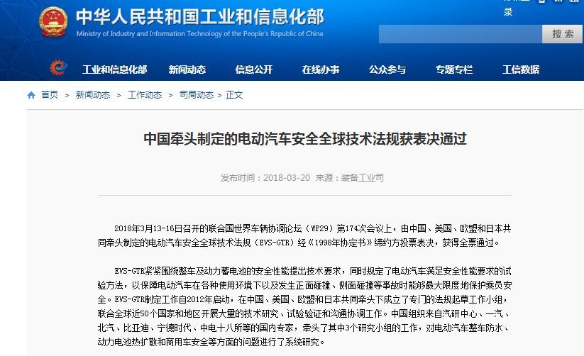昨日,工信部官網(wǎng)消息顯示:在3月13-16日召開(kāi)的聯(lián)合國(guó)世界車(chē)輛協(xié)調(diào)論壇(WP29)第174次會(huì)議上,由中國(guó)、美國(guó)、歐盟和日本共同牽頭制定的電動(dòng)
