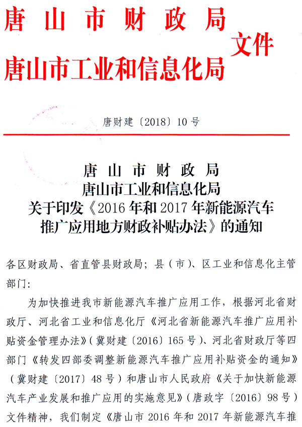 唐山市財政局關(guān)于印發(fā)《2016年和2017年新能源汽車推廣應(yīng)用地方財政補(bǔ)貼辦法》的通知