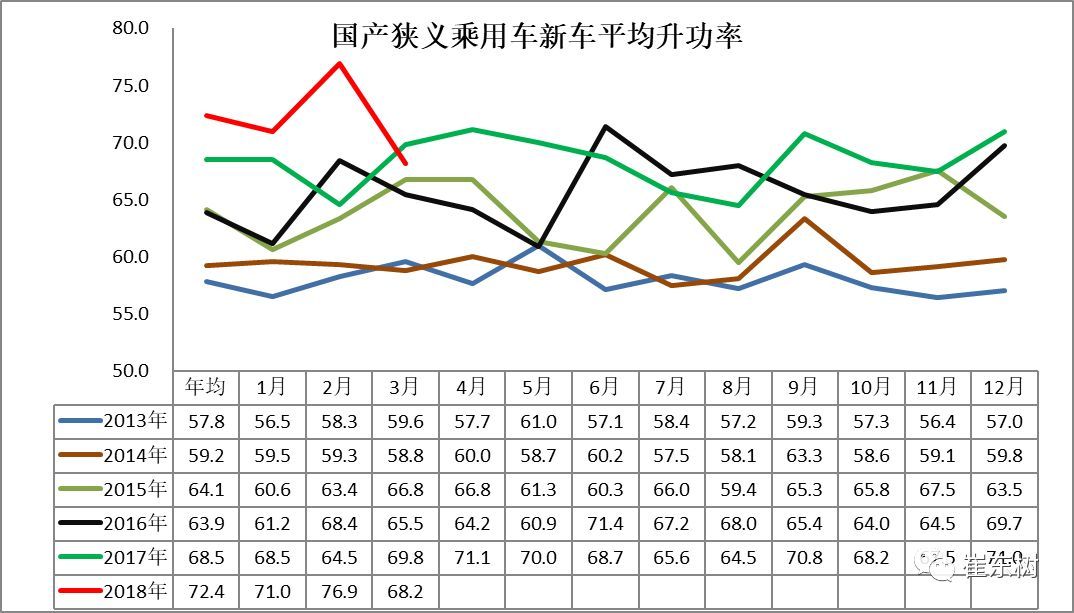 從發(fā)動機動力與油耗的均衡走勢看,近幾年來的油耗和動力提升的均衡管理效果突出。15年的的油耗保持在93%,但新車的平均功率達到64千瓦,整車企業(yè)的技術進步效果較突出。16年的功率狀態(tài)維持在到63.9千瓦/升,油耗也降到4階段的132%;17年的升功率69,油耗132%,油耗動力綜合表現(xiàn)較強,但與外界的發(fā)展速度有所差距。18年3月的新品的動力性也不是很強。