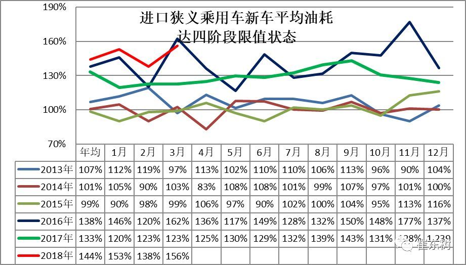 14年的進口車新品的平均油耗為101%,15年的新品油耗達到99%的稍有改善,16年進口車申報車型的平均油耗是四階段目標的138%的較高狀態(tài),17年又迅速降到133%。。17年油耗降低較好。但18年年初油耗偏高,3月的新車油耗為4階段156%,中大型豪華車較多。