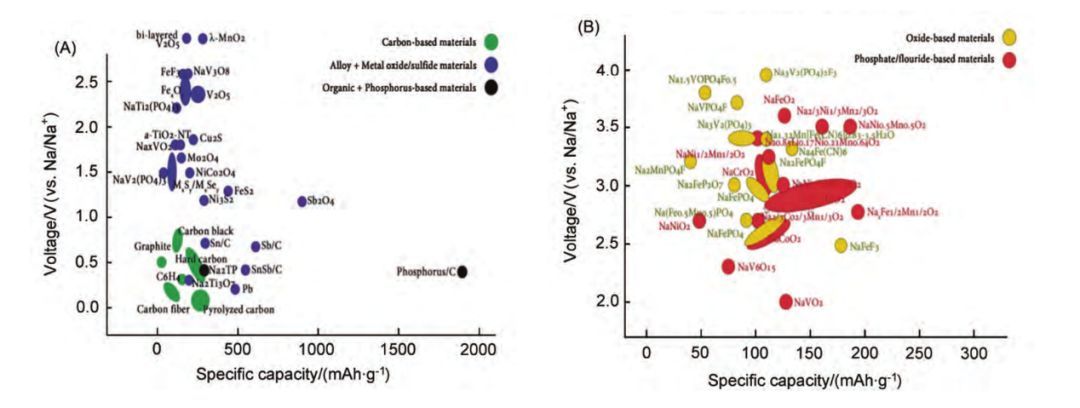 左圖為鈉離子電池常見(jiàn)的正極材料,右圖為常見(jiàn)的負(fù)極材料(橫坐標(biāo)為克容量,縱坐標(biāo)為標(biāo)準(zhǔn)電勢(shì))