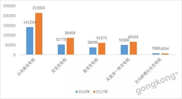 2017年全年月均新增公共類充電樁月6054個,相較2016年月均增長量下降1000多個,增速稍有放緩。