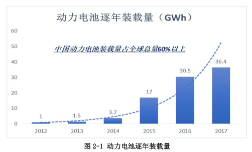 2017年,中國動力電池繼續(xù)保持全球出貨量第一的地位,達 到36.4GWh,占世界動力電池出貨量超過60%。需求拉動、動力 技術(shù)進步、產(chǎn)業(yè)鏈形成、規(guī)模化電芯生產(chǎn)和裝備制造保障能力促進了動力電池產(chǎn)業(yè)的快速發(fā)展。