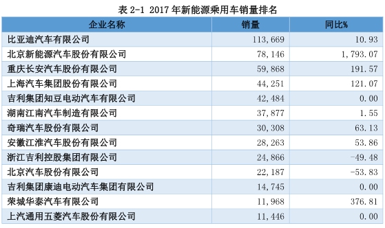 乘用車實現(xiàn)規(guī)模化銷售。2017年,新能源乘用車銷售萬輛以 上規(guī)模的企業(yè)達到16家,其中比亞迪10萬輛,北汽、長安超過 5萬輛,前16家銷量占新能源乘用車總銷量接近90%。