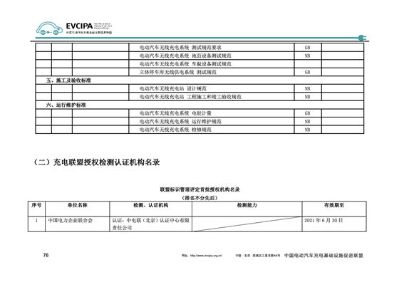 加強行業(yè)自律,充電聯(lián)盟進一步完善對充電設(shè)施實行認證管 理的體系,按照自愿性認證的原則,建立健全充電基礎(chǔ)設(shè)施產(chǎn)品 檢測、認證制度和市場采信機制,將充電設(shè)施品質(zhì)納入認證管理,制定相關(guān)標準。促進提升充電基礎(chǔ)設(shè)施檢測和服務(wù)管理能力,形 成面向行業(yè)服務(wù)的充電基礎(chǔ)設(shè)施檢測評價體系,增強認證和檢測 能力,搭建檢測機構(gòu)間檢測能力比對平臺,加強第三方檢測認證機構(gòu)建設(shè)。