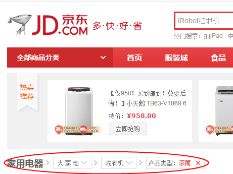 ①導(dǎo)航的自我解釋:虛擬的互聯(lián)網(wǎng)世界沒有現(xiàn)實世界中明顯的方向感,不清晰的導(dǎo)航往往導(dǎo)致用戶流失。一個好的導(dǎo)航設(shè)計最基本的任務(wù)就是要讓用戶知道“我從哪里來?”“我現(xiàn)在在哪里”“我能去哪里”。下圖是在京東商城上搜索購買洗衣機的面包屑元素。