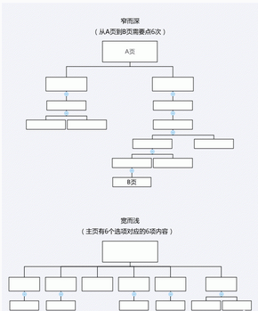 ②深廣度平衡:在導(dǎo)航的信息組織中,層級的數(shù)目一般稱為導(dǎo)航的深度,每一層級中包含的菜單項數(shù)可以稱為導(dǎo)航的廣度。在導(dǎo)航設(shè)計中,需要兼顧深廣度的數(shù)量,保證用戶的瀏覽路徑足夠便捷(選擇少,跳轉(zhuǎn)少,簡單明了)。