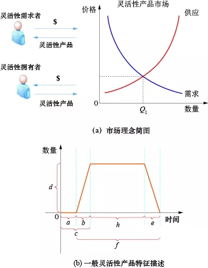 圖4中的(a)、(b)兩圖分別給出了靈活性市場的核心理念和針對一般靈活性產(chǎn)品的特征描述。供需雙方需要首先確定靈活性商品的一般特征參數(shù),如功率范圍、響應(yīng)速度和時長等。在產(chǎn)品特征描述達(dá)成共識的前提下,靈活性需求者和靈活性擁有者在基于供求理論的市場中分別對其所買/所賣的靈活商品進(jìn)行控制、管理、定價(jià)和交易。在靈活性的控制和管理上,各種直接和間接的控制手段都可以用來控制獨(dú)立的靈活性資源或者基于聚合方式(aggregation)的大量靈活性資源。