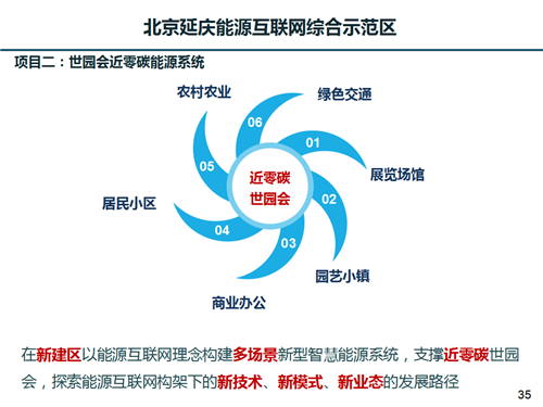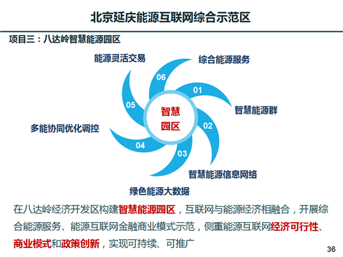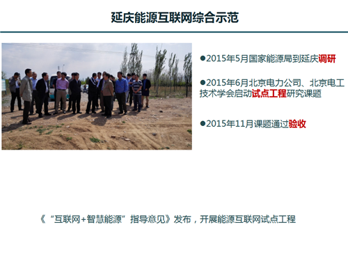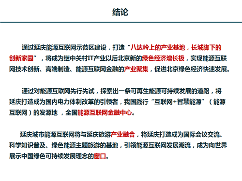 他介紹到,通過延慶能源互聯(lián)網(wǎng)示范區(qū)建設(shè),打造“八達(dá)嶺上的產(chǎn)業(yè)基地,長城腳下的創(chuàng)新家園”,將成為繼中關(guān)村IT產(chǎn)業(yè)以后北京新的綠色經(jīng)濟(jì)增長極,實(shí)現(xiàn)能源互聯(lián)網(wǎng)技術(shù)創(chuàng)新、高端制造、能源互聯(lián)網(wǎng)金融的產(chǎn)業(yè)聚集,促進(jìn)北京綠色經(jīng)濟(jì)快速發(fā)展。通過對能源互聯(lián)網(wǎng)先行先試,探索出一條可再生能源可持續(xù)發(fā)展的道路,將延慶打造成為國內(nèi)電力體制改革的引領(lǐng)者,我國踐行“互聯(lián)網(wǎng)+智慧能源”(能源互聯(lián)網(wǎng))的發(fā)源地,全國能源互聯(lián)網(wǎng)金融中心。延慶城市能源互聯(lián)網(wǎng)將與延慶旅游產(chǎn)業(yè)融合,將延慶打造成為國際會議交流、科學(xué)知識普及、綠色能源主題旅游的基地,引領(lǐng)能源互聯(lián)網(wǎng)發(fā)展潮流,成為向世界展示中國綠色可持續(xù)發(fā)展理念的窗口。未來,將在延慶實(shí)現(xiàn)可再生能源100%利用,打造綠色延慶,實(shí)現(xiàn)100%煤炭替代,實(shí)現(xiàn)低碳“世園會”、綠色“冬奧會”;踐行“互聯(lián)網(wǎng)+智慧能源”(能源互聯(lián)網(wǎng))的發(fā)源地,讓延慶成為全國能源互聯(lián)網(wǎng)金融中心,成為電力體制改革的引領(lǐng)者。