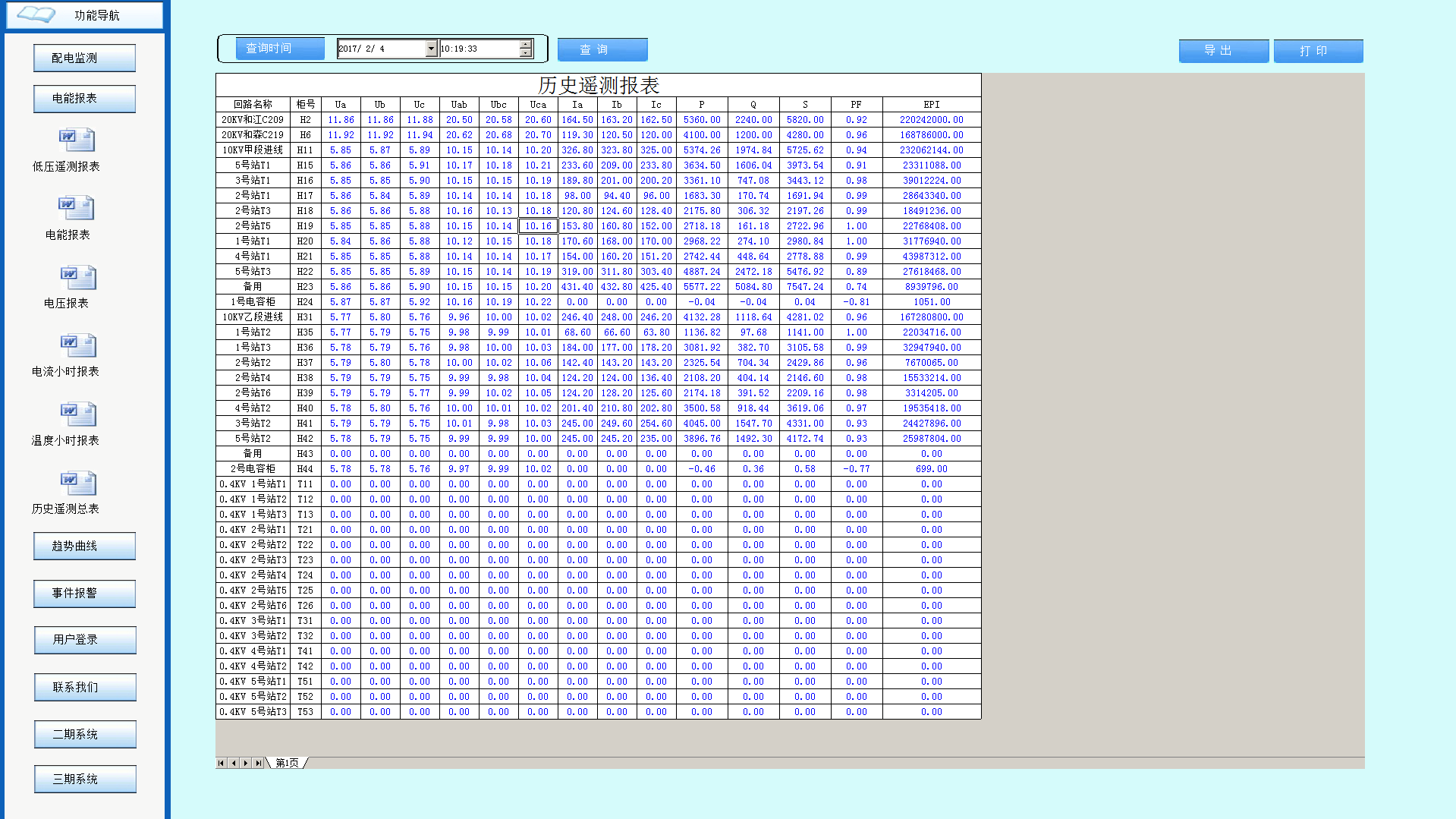 功能要求:高壓回路的一次圖界面應(yīng)顯示回路名稱、三相電流、三相線電壓、總有功功率、總無功功率、總功率因數(shù)、頻率和開關(guān)量光字牌。10kV配電系統(tǒng)中所需要監(jiān)測的開關(guān)量為:斷路器分合閘信號、手車工作/試驗位置信號、遠方/就地切換位置信號、彈簧儲能位信號、接地刀信號、超高溫跳閘信號、高溫報警信號、事故信號和預(yù)告報警信號;低壓進線回路電參量界面顯示:回路名稱、開關(guān)狀態(tài)、三相電流、三相電壓、總有功功率、總無功功率、總功率因數(shù)、頻率和正向有功電能累計值。低壓出線回路界面顯示:回路名稱、開關(guān)狀態(tài)、三相(單相)電流。每個回路旁設(shè)置詳細參數(shù)按鈕,通過點擊可查看該回路詳細電參量,包括三相電流、三相電壓、總有功功率、分相有功功率、總無功功率、分相無功功率、總功率因數(shù)、分相功率因數(shù)、頻率、正向有功電能、反向有功電能、感性無功電能、容性無功電能。