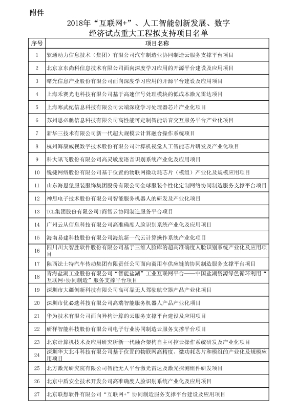 附 件:2018年“互聯(lián)網(wǎng)+”、人工智能創(chuàng)新發(fā)展、數(shù)字經(jīng)濟試點重大工程擬支持項目名單