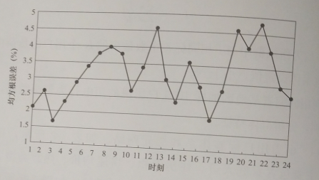 (2)相似用戶群體識別與分析。利用表7-2所述的相似用戶群體分析方法,設(shè)定群用戶數(shù)量N=50,識別出相似用戶群體的共同標簽特征包括:2~3人、60~90㎡、7000~12000元/㎡、燃氣、市政熱力。利用式(7-7)計算出群體的典型日負荷向量,與50戶個體負荷向量各個小時的均方根誤差均值見圖7-11,各時刻平均為3.2%,表明群體典型日負荷向量與個體負荷向量誤差較小,較為準確地體現(xiàn)了群體中個體普遍的用電行為特征。因此,群體識別方法能夠有效識別出具有相似用電行為的用戶群體。