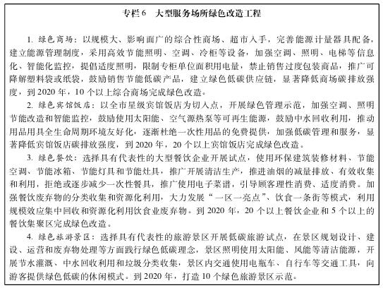 重點推動住宿和餐飲、批發(fā)零售、倉儲和物流、旅游景點等傳統(tǒng)服務業(yè)低碳轉型發(fā)展,建立服務業(yè)重點企業(yè)用能監(jiān)管制度,鼓勵企業(yè)選用節(jié)能節(jié)水設備、實施節(jié)能技術改造,創(chuàng)建一批綠色商場、賓館飯店、餐飲企業(yè)和物流基地。