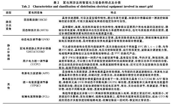 提高電能質(zhì)量是智能電網(wǎng)構(gòu)建的一個(gè)重要目標(biāo),在配電方面涉及大量的電力電子設(shè)備。而作為FACTS技術(shù)在配電系統(tǒng)應(yīng)用的延伸,DFACTS(DISTRIBUTIONFACTS)技術(shù)綜合了配電網(wǎng)未來(lái)新技術(shù)的應(yīng)用。DFACTS技術(shù)與輸電系統(tǒng)中的FACTS技術(shù)側(cè)重不同,F(xiàn)ACTS設(shè)備的主要作用是調(diào)整輸電線(xiàn)路的參數(shù),控制線(xiàn)路的潮流,提高輸電線(xiàn)路的功率傳輸極限,使輸電線(xiàn)路的潮流能按預(yù)定計(jì)劃實(shí)現(xiàn)控制,提高全網(wǎng)的經(jīng)濟(jì)性,也可以通過(guò)快速控制提高系統(tǒng)動(dòng)態(tài)性能,如調(diào)節(jié)電壓、控制功率振蕩和抑制次同步振蕩等,而DFACTS技術(shù)主要用來(lái)提高供電質(zhì)量,即減小諧波和畸變、電壓波動(dòng)與閃變、電壓暫降與電壓中斷、消除三相不平衡,使電壓的幅值和波形符合要求、提高功率因數(shù)等。配電網(wǎng)涉及的智能電力設(shè)備如表2所示。