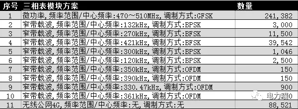 三相智能電能表共選用了10種不同的窄帶載波方案和微功率無線方案。