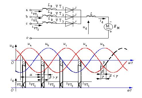 換相重疊角的影響:當β>γ時,換相結(jié)束時,晶閘管能承受反壓而關斷。如果β<γ時(從圖右下角的波形中可清楚地看到),該通的晶閘管(VT2)會關斷,而應關斷的晶閘管(VT1)不能關斷,最終導致逆變失敗。