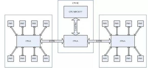 每個(gè)網(wǎng)絡(luò)接口板配置8個(gè)網(wǎng)絡(luò)接口。每個(gè)以太網(wǎng)口均有l(wèi)ink及act指示燈,用于表征各網(wǎng)絡(luò)接口及接口板的工作狀態(tài)。通過(guò)更換元器件可實(shí)現(xiàn)網(wǎng)絡(luò)的電接口或光接口。網(wǎng)絡(luò)接口板通過(guò)FPGA實(shí)現(xiàn)以太網(wǎng)口驅(qū)動(dòng)、網(wǎng)絡(luò)接口板與CPU板的通信。網(wǎng)絡(luò)接口板與背板聯(lián)絡(luò),為光纖接口和CPU通信傳遞信息。網(wǎng)絡(luò)接口板與CPU板之間采用光纖通信。