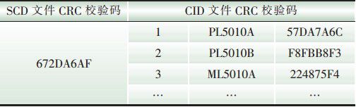 集成商根據(jù)表2檢測結(jié)果繼續(xù)對(duì)SCD文件進(jìn)行修改,直到符合標(biāo)準(zhǔn)化要求,然后導(dǎo)出裝置的CID文件進(jìn)行下裝調(diào)試工作,表3顯示了導(dǎo)出的CID文件虛端子CRC校驗(yàn)碼和SCD校驗(yàn)碼之間的關(guān)系,通過CRC校驗(yàn)碼來進(jìn)行調(diào)試過程文件管控。