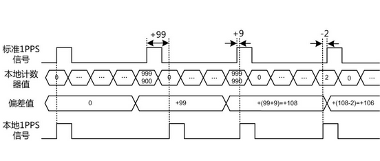 DT6000系列在對時的同時會進(jìn)行校時,校正本地晶振的誤差值。圖1.6為校時調(diào)整的一個實例說明圖,由圖中可以看出第一次粗略調(diào)節(jié)值為+99,第二次精確調(diào)節(jié)為正向,此時的Value=+99+9=+108,第三次精確調(diào)節(jié)為反向,此時的Value=+108-2=+106,在獲取Value值的同時計數(shù)器也在一直均勻的調(diào)節(jié)。