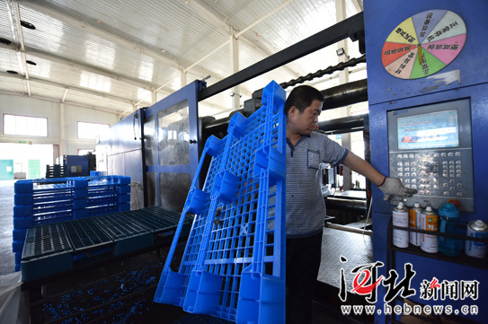 文安經(jīng)濟(jì)開發(fā)區(qū)智能電網(wǎng)產(chǎn)業(yè)園河北伯爵塑料制品有限公司工作人員取出塑料托盤。
