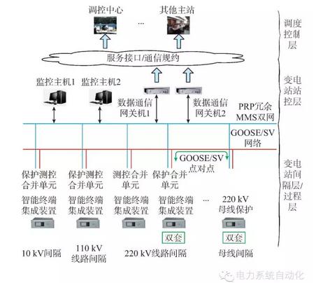 為實現(xiàn)上述需求,本文探討了一種新型變電站自動化系統(tǒng)實現(xiàn)方案。該系統(tǒng)可以減少功能實現(xiàn)環(huán)節(jié)、減少虛端子數(shù)量、提升網(wǎng)絡(luò)冗余性能,提升變電站對各級調(diào)控主站的支撐能力。典型的220kV智能變電站自動化系統(tǒng)結(jié)構(gòu)如圖1所示,線路間隔的間隔層設(shè)備和過程層設(shè)備進行了縱向集成整合,系統(tǒng)網(wǎng)絡(luò)采用并行冗余網(wǎng)絡(luò)協(xié)議(PRP)實現(xiàn)雙網(wǎng),監(jiān)控功能實現(xiàn)面向服務(wù)統(tǒng)一設(shè)計。