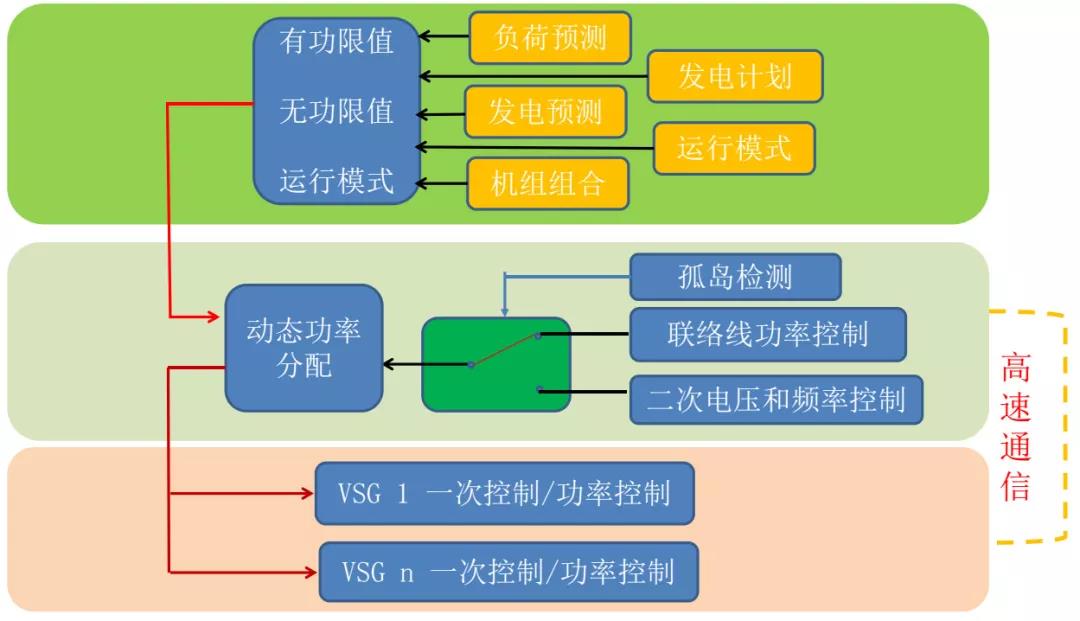 微電網(wǎng)不同于單個變流器,需要基于分層控制技術(shù)。上層主要是發(fā)電計劃、運行模式、負(fù)荷預(yù)測、發(fā)電預(yù)測和機(jī)組組合的控制,中間層主要是孤島檢測、聯(lián)絡(luò)線功率控制、二次電壓和頻率控制,底層即電源層,主要是進(jìn)行一些VSG控制,阻尼阻抗、諧振抑制、功率分配等。