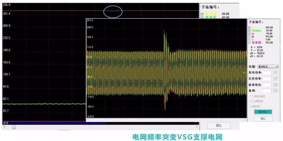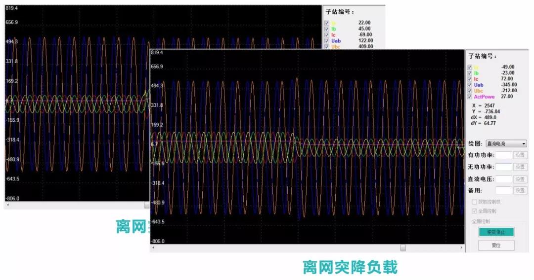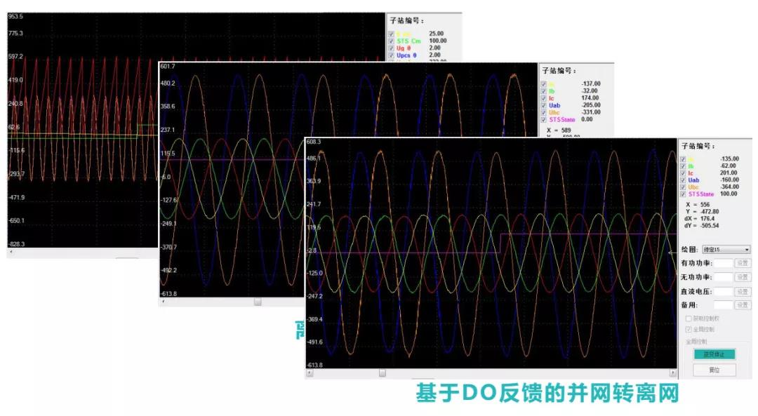 上圖是某項目的并離網(wǎng)切換實驗。它是計劃性的并離網(wǎng)切換,離網(wǎng)轉(zhuǎn)并網(wǎng),同期跟蹤電網(wǎng)相位,然后基于VSG的同期分層控制,并網(wǎng)開關(guān)閉合,完成了離網(wǎng)向并網(wǎng)的轉(zhuǎn)換,這個過程中并離網(wǎng)信號通過DO來反饋,速度比較快。